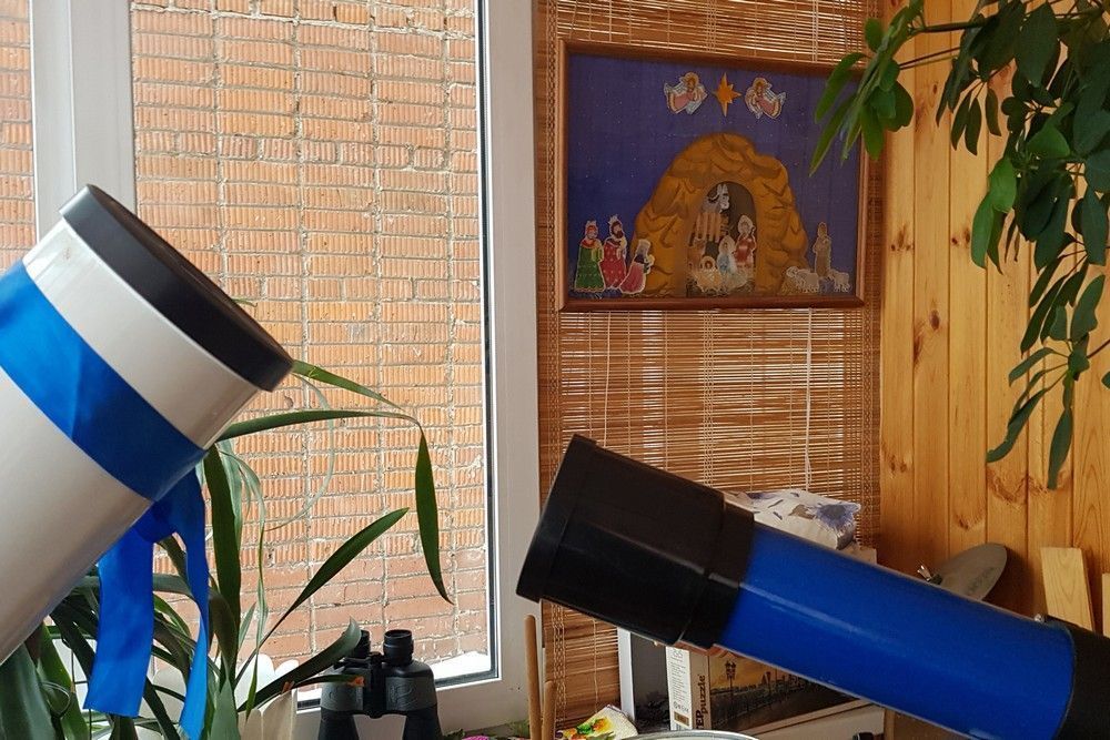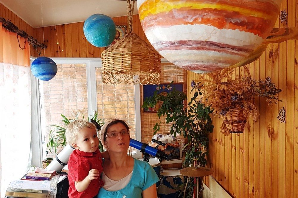 В столовой семьи Штаудингер помимо стола, стульев и самовара – «открытый космос». Здесь стоит настоящий телескоп, а с потолка свисают самодельные модели планет, выполненных в одном масштабе, чтобы видеть соотношение их размеров. В коридоре – аквариум с улитками, клетки с канарейками и попугаями – дети учатся ухаживать за братьями меньшими.