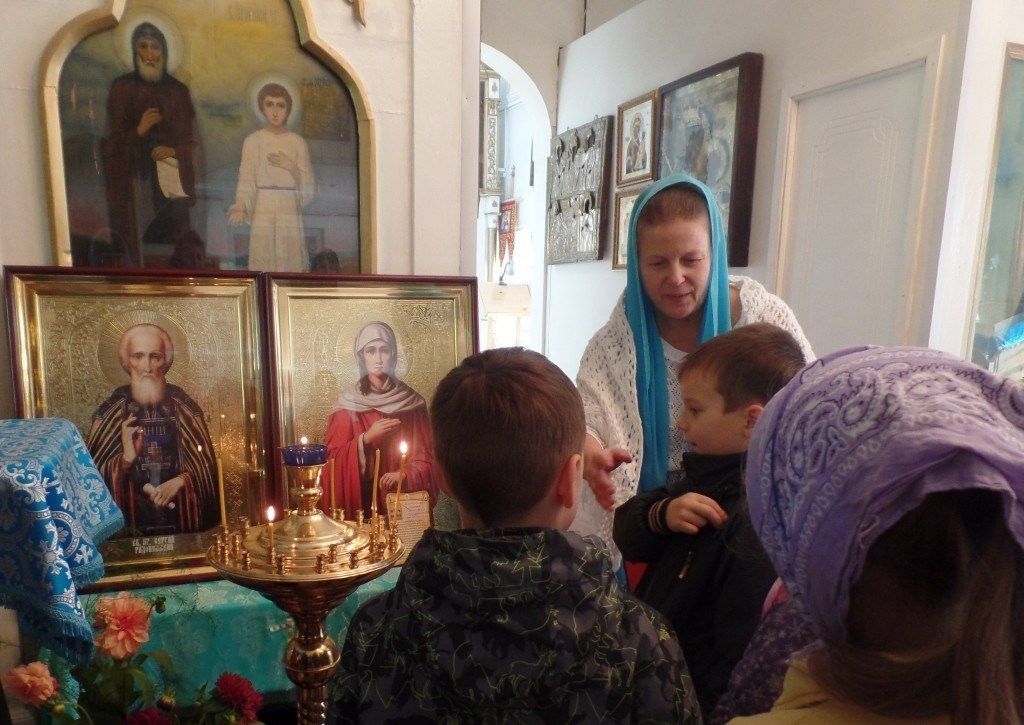 При входе в ограду храма учеников встретил настоятель прихода протоиерей Андрей Ермилов и преподаватель Л. Олехова, которые рассказали детям об истории этого места, о строительстве храма и том, почему и зачем строятся церкви. Дети с живым интересом слушали рассказ и задавали вопросы. После экскурсии они посмотрели мультфильм «Путеводительница», посвященный Тихвинской иконе Божией Матери.